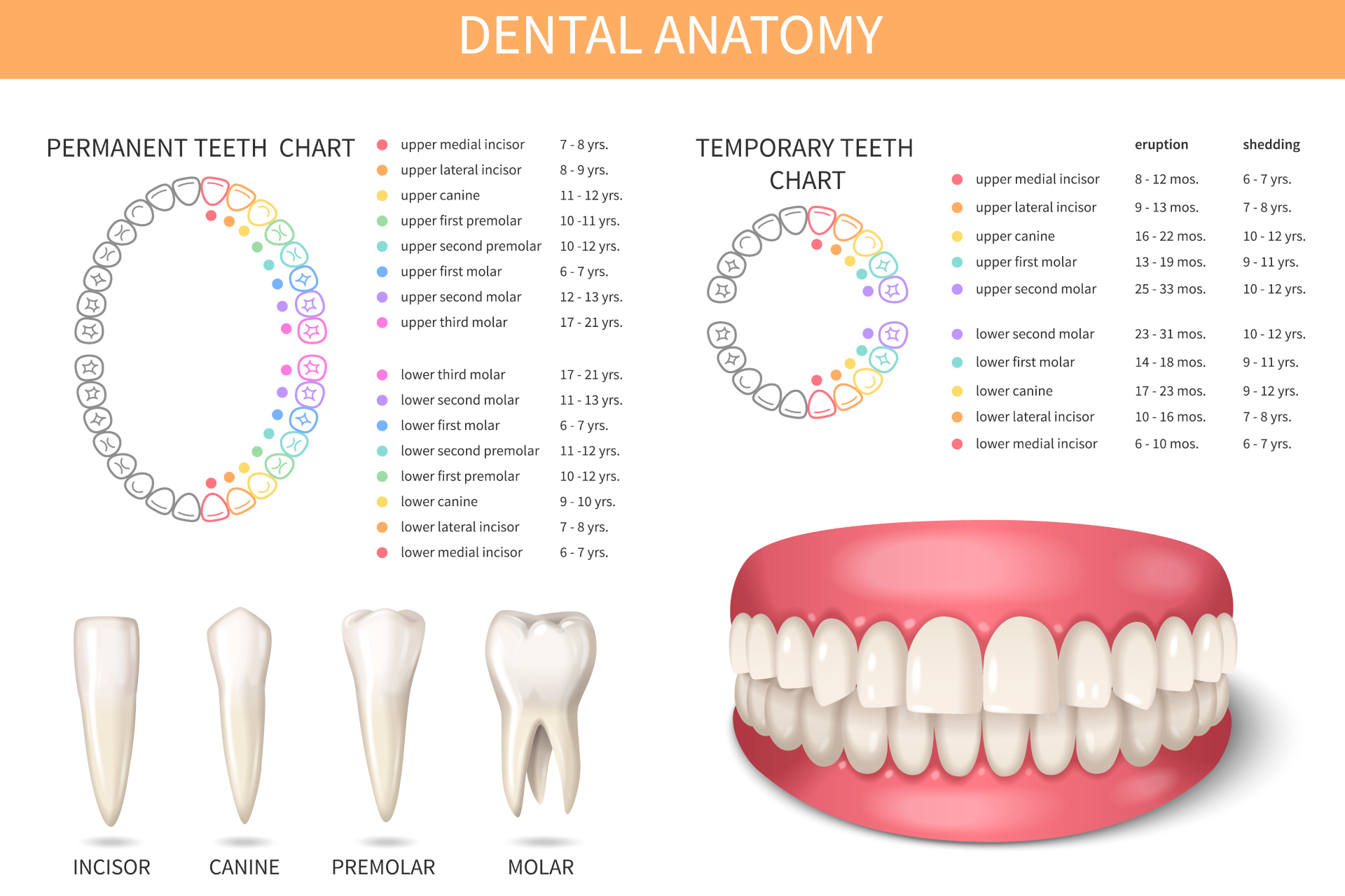 Gigi manusia memiliki 2 periode pembentukan, yaitu pada gigi susu dan gigi tetap. Gigi susu mulai muncul sekitar usia 6-10 bulan. Nantinya, satu per satu gigi susu ini akan mulai digantikan oleh gigi tetap ketika anak berusia sekitar 6-7 tahun. Normalnya, setiap manusia memiliki empat jenis gigi, yaitu gigi seri, gigi taring, gigi premolar, dan gigi geraham yang termasuk di dalamnya gigi bungsu. Tiap jenis gigi memiliki bentuk yang sedikit berbeda dengan fungsinya masing-masing. Berikut ini adalah fungsi gigi berdasarkan jenis-jenisnya: